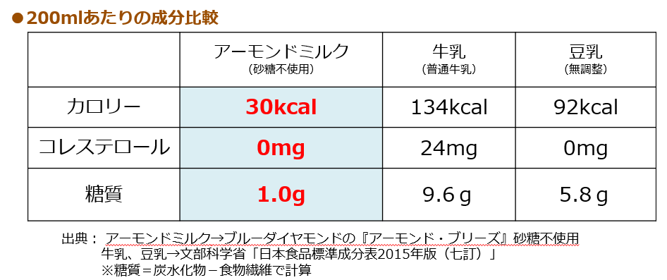 アーモンドミルクは牛乳、豆乳と比較して低カロリー、低糖質。さらにコレステロールゼロでヘルシーな飲み物です。また、乳糖のようなアレルギー物質を一切含まないことから、牛乳を飲めないアレルギー体質の方でも安心して飲むことができます。