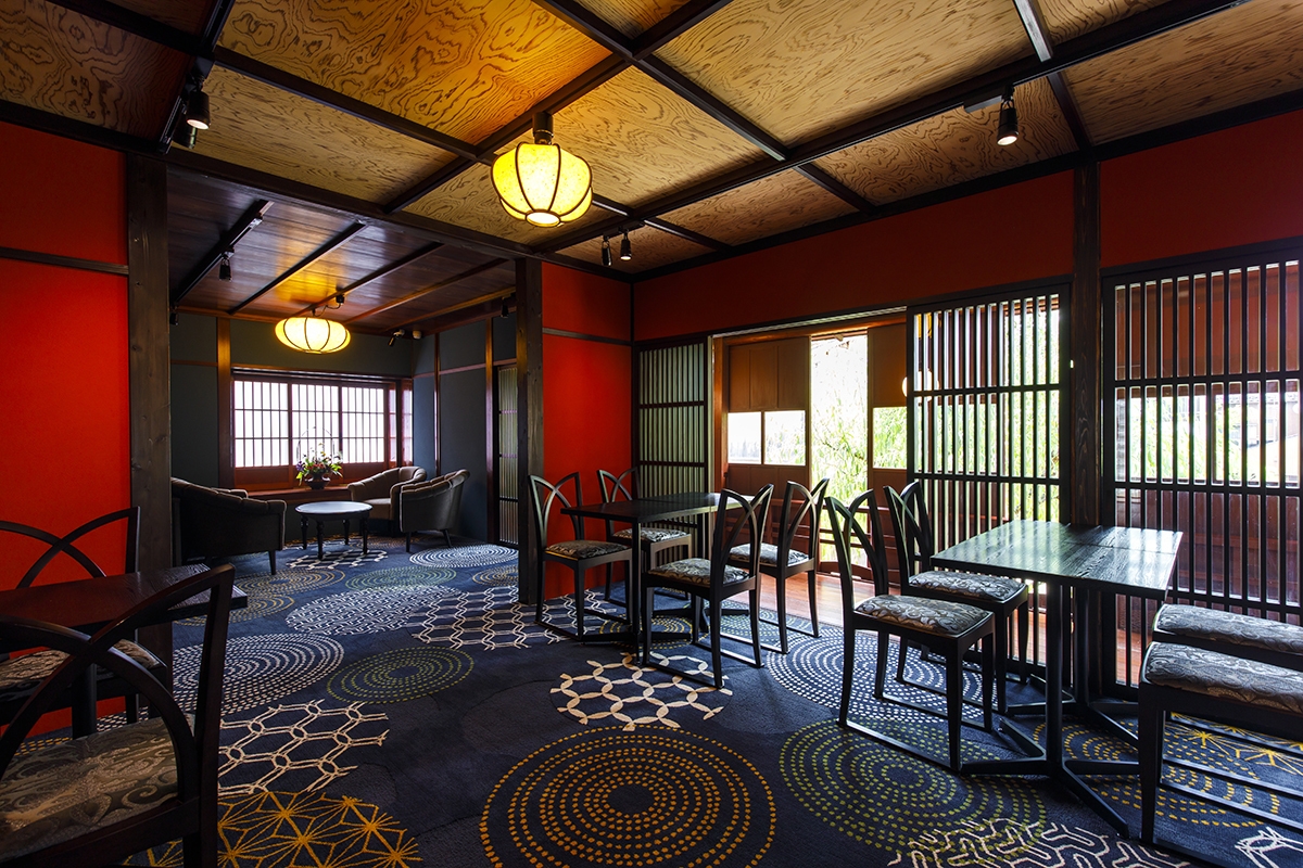 2階部分は広々としたカフェとしました。特注のカーペットは、かつて行われていた浅野川の花火をイメージし、華やかながら落ち着いた和の雰囲気となっています。