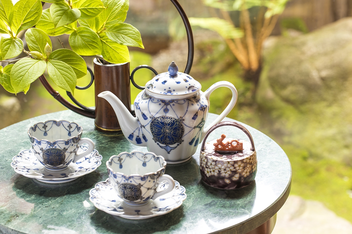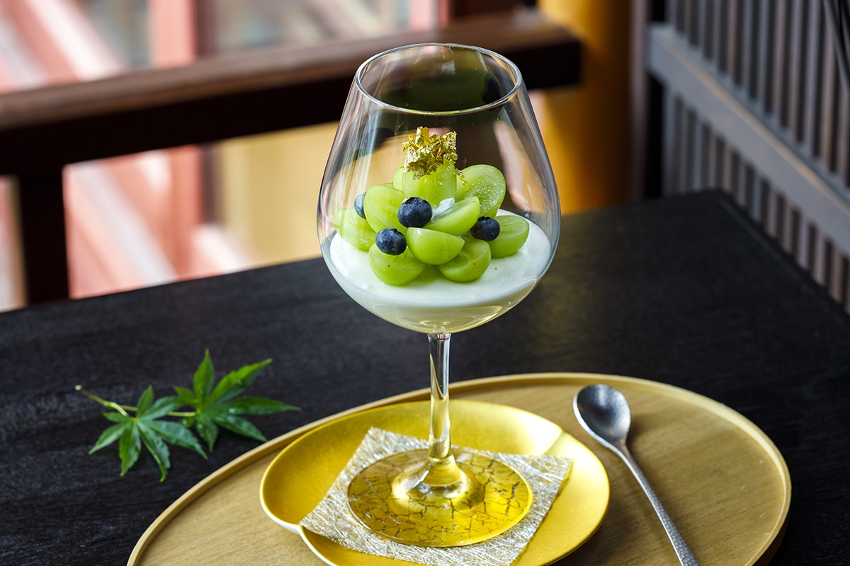 2階のスペースにはゆったりとくつろげる茶房を設けました。ここからは、茶屋街を見渡す心地よい景色を楽しめます。かつての接待場所にもなっていた座敷から、往時の茶屋遊びに興じた人々と同じ景色を楽しむことができます。メニューは、伝統工芸品の茶碗で楽しむお抹茶と金沢の和菓子のセットのほか、季節のフルーツをふんだんに使ったパフェなど、多彩なメニューを取り揃えています。