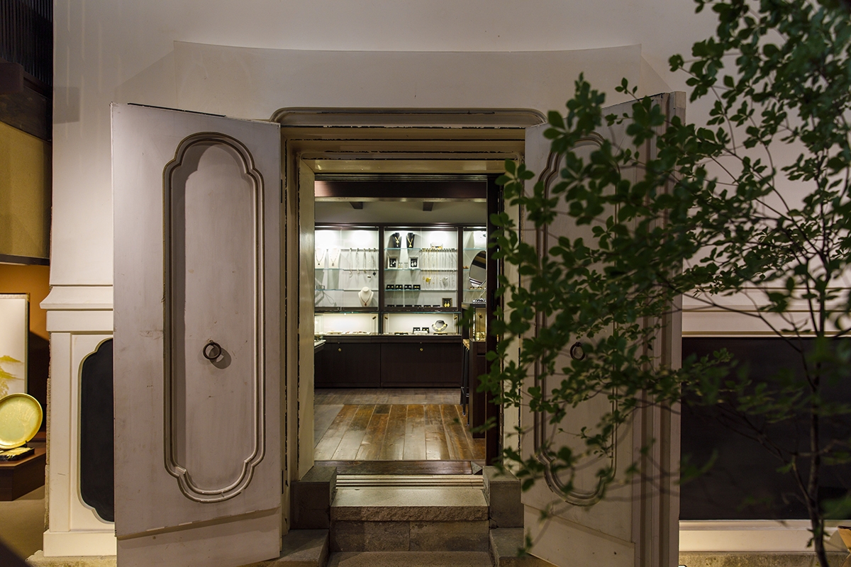 改修にあたっては、茶屋の建築文化を継承するとともに、お客様の利便性を考慮し、フロアをフラットにしてお靴のまま見ていただけるようにしました。また、壁を一部取り外し、見通しのよい広々とした空間となりました。さらに、200年の歴史を大切にし、各年代の改修工事の名残を尊重しました。例えば、かつて別の場所に使われていた欅一枚板をカウンターに再利用したり、土間の2階部分の床材を1階のフローリングに利用するなど、それぞれの部材も大切に受け継いでいます。