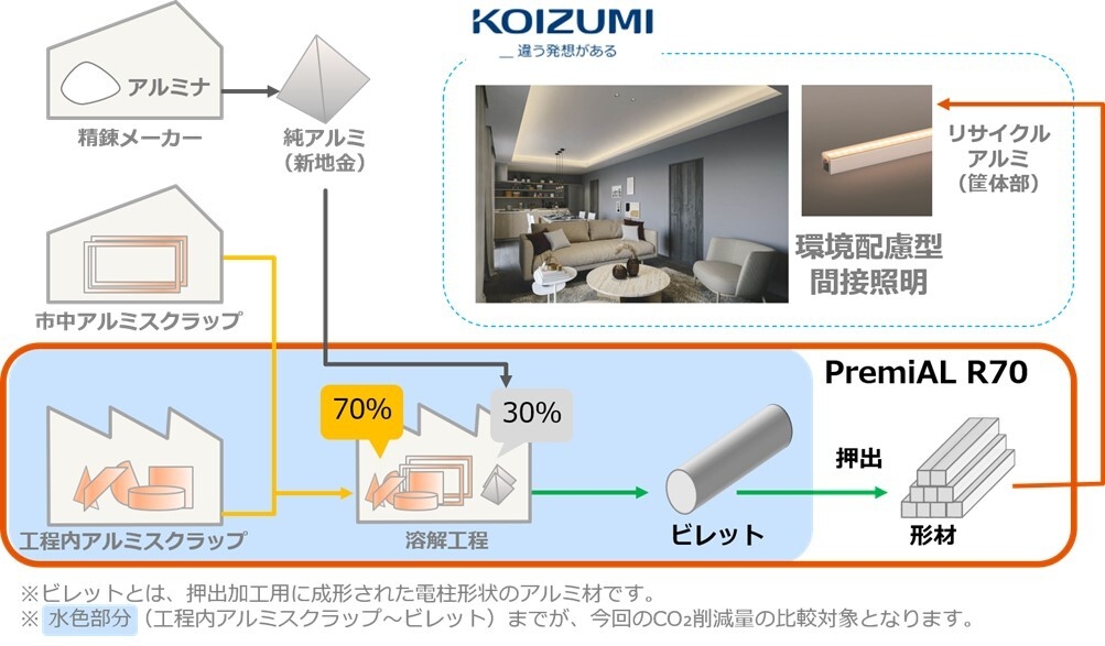 コイズミ照明株式会社(以下、当社)は環境配慮型製品創出の一環としてこのほど、当社の「ライトバー間接照明ミドルパワー」(96機種)の筐体部に、株式会社LIXIL(以下、LIXIL)の循環型低炭素アルミ形材「PremiAL R70」を採用することになりましたのでお知らせいたします。