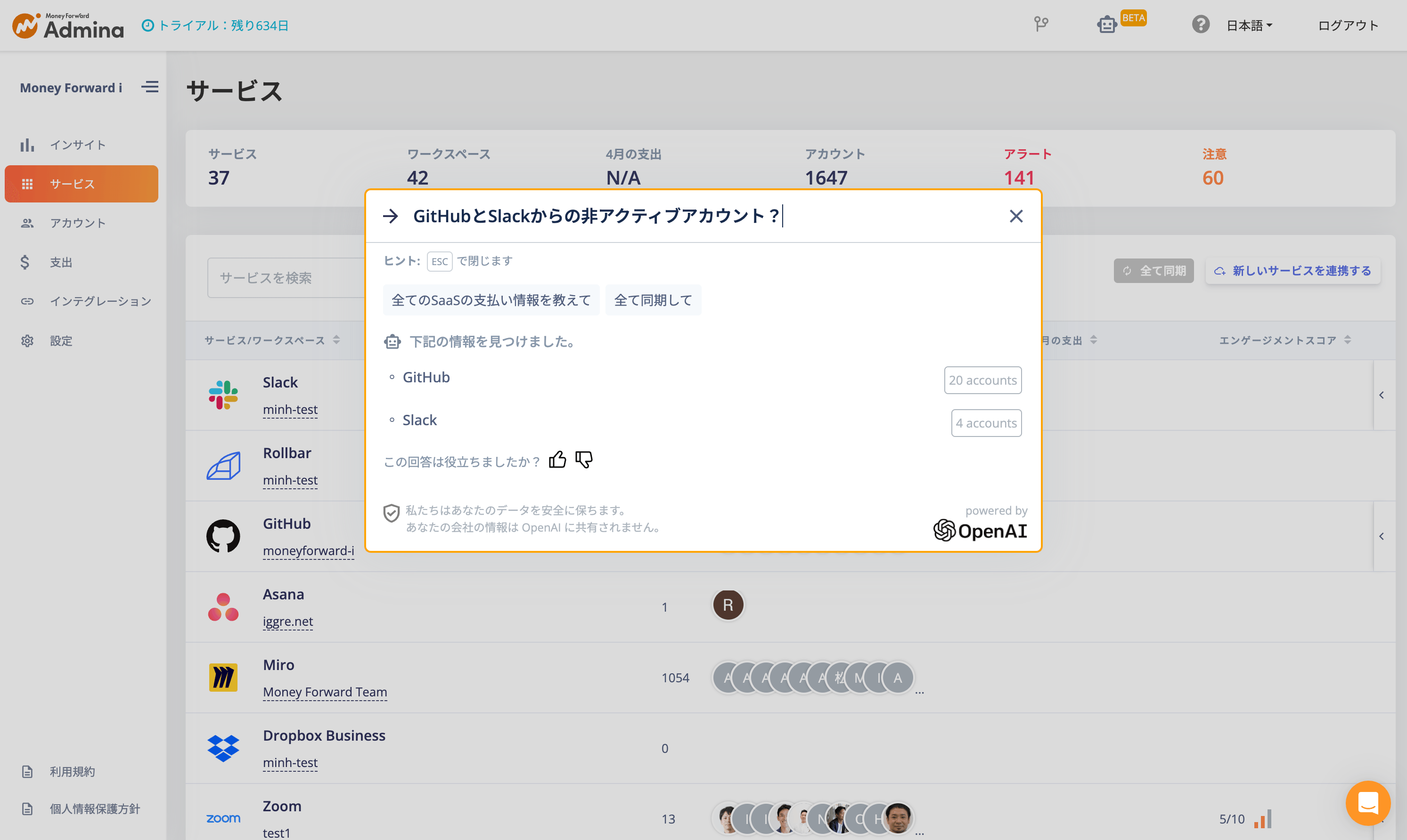 マネーフォワードi株式会社は、SaaS管理プラットフォーム『マネーフォワード Admina』(以下「Admina」)において、ChatGPT APIを活用した新機能「Admina AI」の提供を2023年6月より開始します。参照したい情報をテキスト入力するだけで、情報検索や、アカウント削除などの操作がテキスト入力で完結し、SaaSマネジメント業務が効率化します。