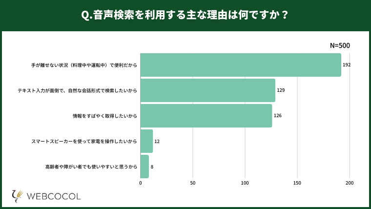 - 利用理由は「手が離せない状況で便利だから」(38%)が最多、次いで「自然な会話形式で検索したいから」(26%)。