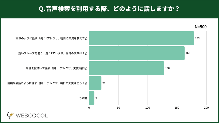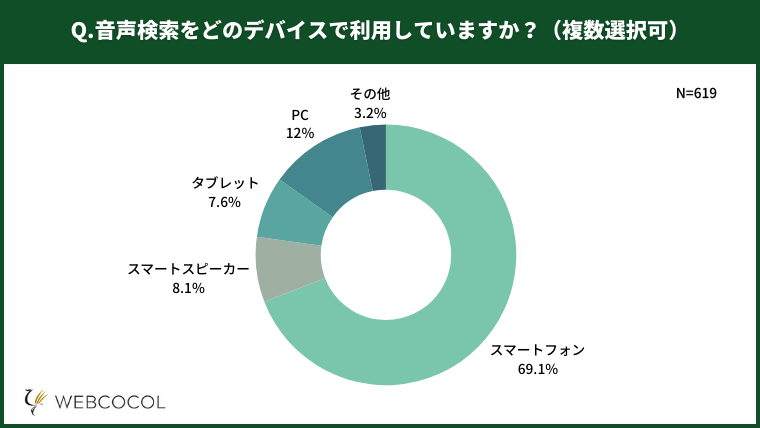 ウェブココル株式会社はSEOコンサルティングを行う企業として、音声検索を行う頻度や用途について当社の推定より大きく上回る結果となりました。音声アシスタント市場は年々成長しているとされ、時代にあったSEOが求められていると当社は考えています。