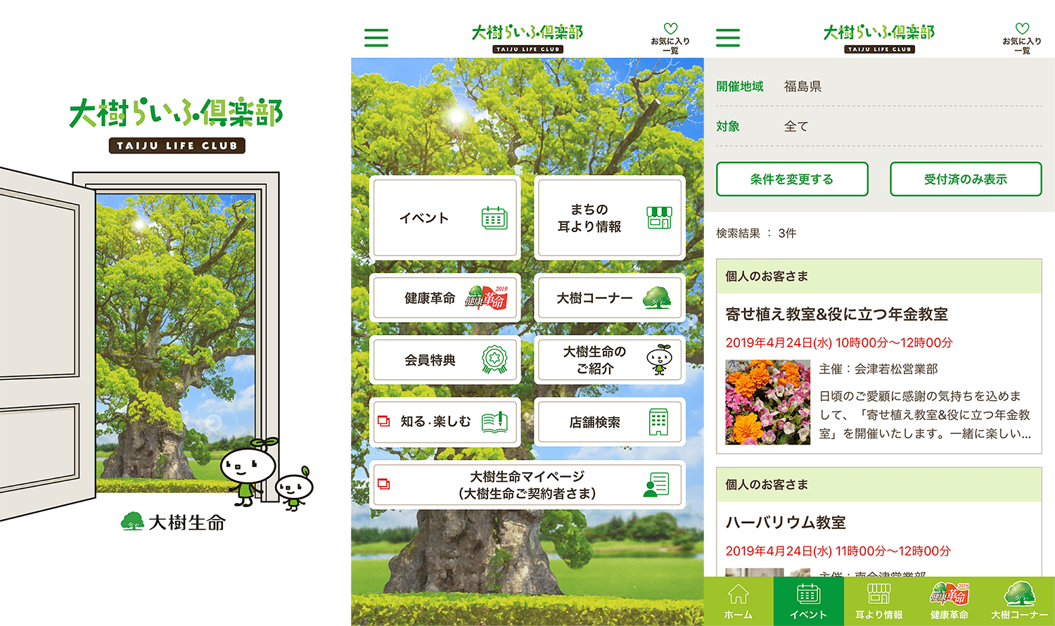 大樹生命保険株式会社は2019年4月1日に旧三井生命保険株式会社より社名を変更されました。『大樹らいふ倶楽部』は、お客様のライフスタイルに合わせたきめ細やかなサービスを実現する地域密着型のスマホアプリとして、2018年12月より一部地域を対象にサービスの先行展開をしておりましたが、この社名変更に合わせ、4月1日より正式に全国展開をスタートされました。