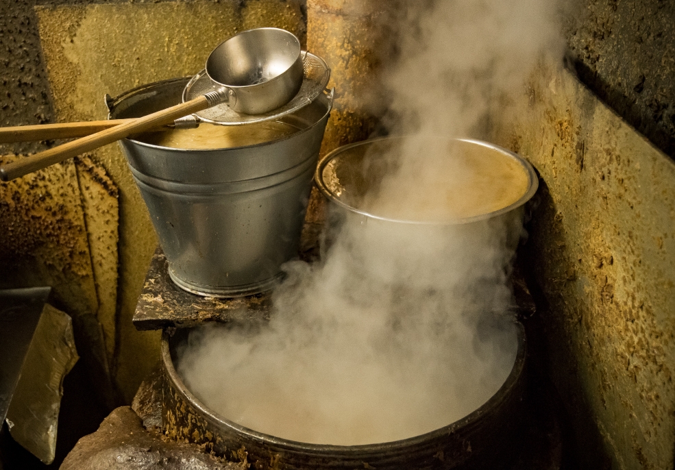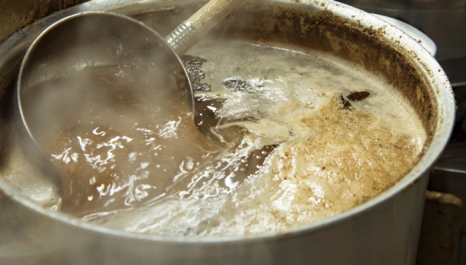 専用の羽釜を使用し、大量の豚骨を贅沢に使用した豚100%のスープです。高火力で長時間絶えずかき混ぜながら、髄も骨も溶けるまで徹底的に煮出しています。旨味を濃縮した「超濃厚スープ」は臭みがなく、香ばしくトロっとしているのが特徴です。