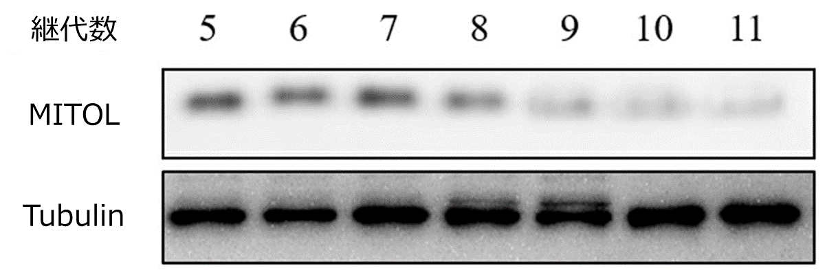 肌細胞の継代を繰り返し、細胞の老化を誘導し、MITOLタンパク発現量を評価した。継代数が増えるに従って、MITOLタンパク発現量(黒色バンド)の減少が確認された。