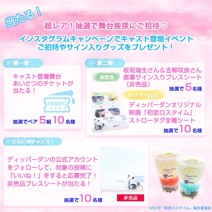 期間中、特設キャンペーンサイトの条件を満たしたインスタグラム投稿を対象として、投稿してくださった方の中から抽選で、9月20日(金)公開の映画『初恋ロスタイム』"キャスト登壇舞台挨拶ペアチケット”や、”キャスト直筆サイン入りプレスシート”、”オリジナルストロータグ全種コンプリートシート”をプレゼントいたします!