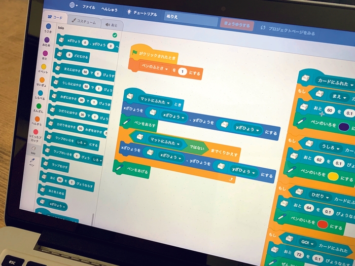 本日4/23より単体として新発売される「toio™コア キューブ」にはリアルタイム絶対位置検出、6軸姿勢検出・イベント検出といった長期の研究を経て実現されたテクノロジーが詰まっています。プログラミング教室でおなじみのビジュアルプログラミングも、JavaScript等のプログラミング言語の使用も可能ですから、ロボット工学や自動運転・ゲーム開発などで培われた技術を手軽に応用して、ロボットプログラミングをすることができます。