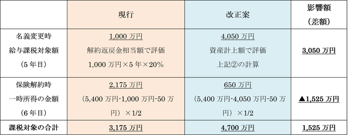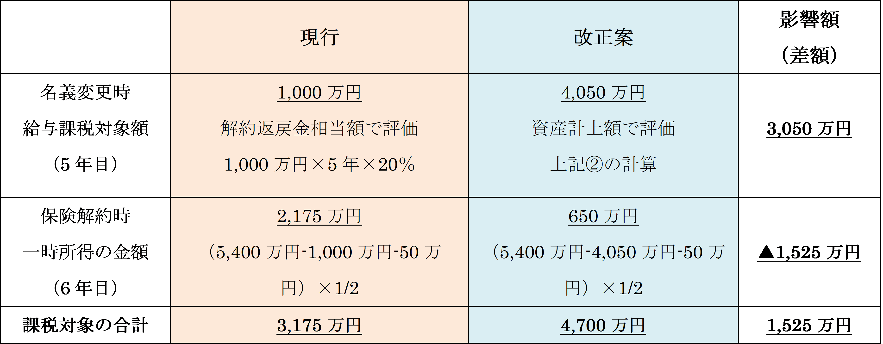 現行の制度では、法人契約の権利を役員や従業員に名義変更した場合(上記②)に、役員や従業員へ保険契約の権利という経済的な利益を無償で渡したことになるため、「名義変更時の解約返戻金相当額」が給与所得として課税の対象とされます。上記の例だと5年目の名義変更時に解約返戻金相当額の600万円(600万円×5年×20%(解約返戻率)) が給与所得として課税されます。しかし、名義変更のタイミングを翌年にすると解約返戻金額は2,700万円(600万円×5年×90%)となり、給与所得として課税される金額に大きな差があります。