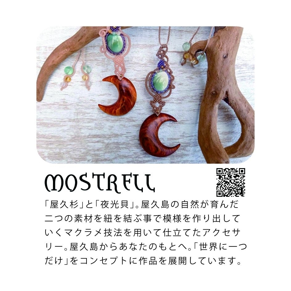 「屋久杉」と「夜光貝」。屋久島の自然が育んだ素材をマクラメ技法を用いて仕立てたハンドメイドアクセサリーを制作しています。