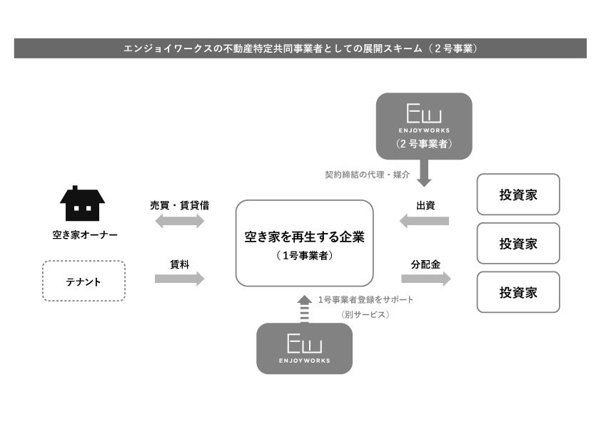 エンジョイワークス、不動産特定共同事業者許可を取得 (2019年3月6日付、 小規模不動産特定共同事業者登録から切り替え) 持続可能な空き家再生スキームを全国に展開