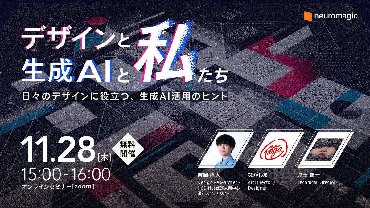 デザインの力(※1)で顧客のパーパス実現を支援する株式会社ニューロマジック(本社:東京都中央区、代表取締役社長CEO:黒井 基晴 以下 当社)は、2024年11月28日(木)実践トークセッション「デザインと生成AIと私たち~日々のデザインに役立つ、生成AI活用のヒント~」をオンラインで実施いたします。シリーズとして今後継続して実施予定、第一回はデザインリサーチャー、アートディレクター、エンジニアの3名が登壇し、各自の視点から生成AIの実務における活用法や知見、具体的な手法を共有します。