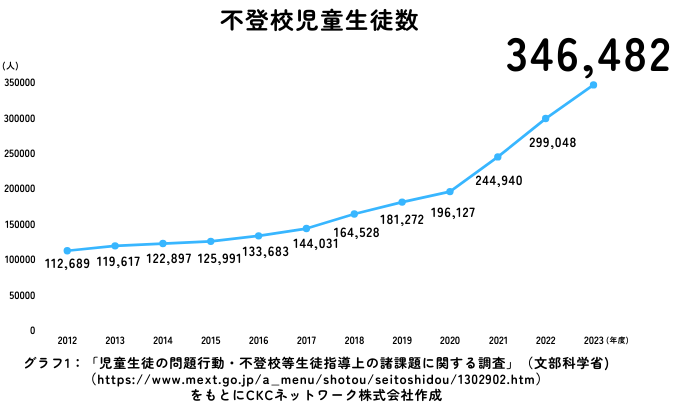 不登校児童生徒は年々増加しており、大きな社会問題となっています。文部科学省の発表では2012年では約11万人であった不登校児童生徒は2023年には約35万人となっています(グラフ1)。この数字は病気を理由とせず、年間30日以上の欠席をした生徒を不登校として計上しているものです。そのため、不登校の前段階にあたる「行き渋り」や「五月雨登校」を考慮するとその数はさらに多くなることが予測されます。