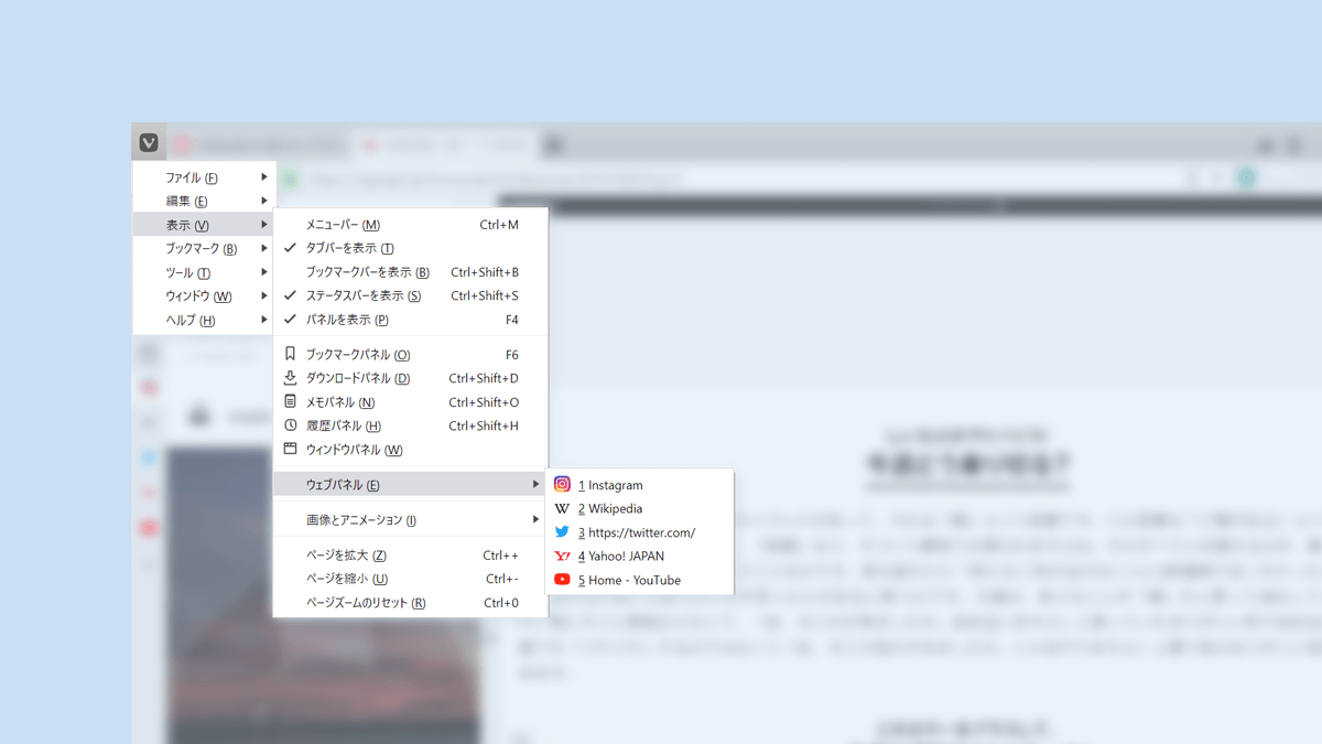キーボードショートカット、マウスジェスチャー、クイックコマンドなど、Vivaldiでは素早く操作できるさまざまな方法を用意しています。Vivaldiのメニューもその一つです。