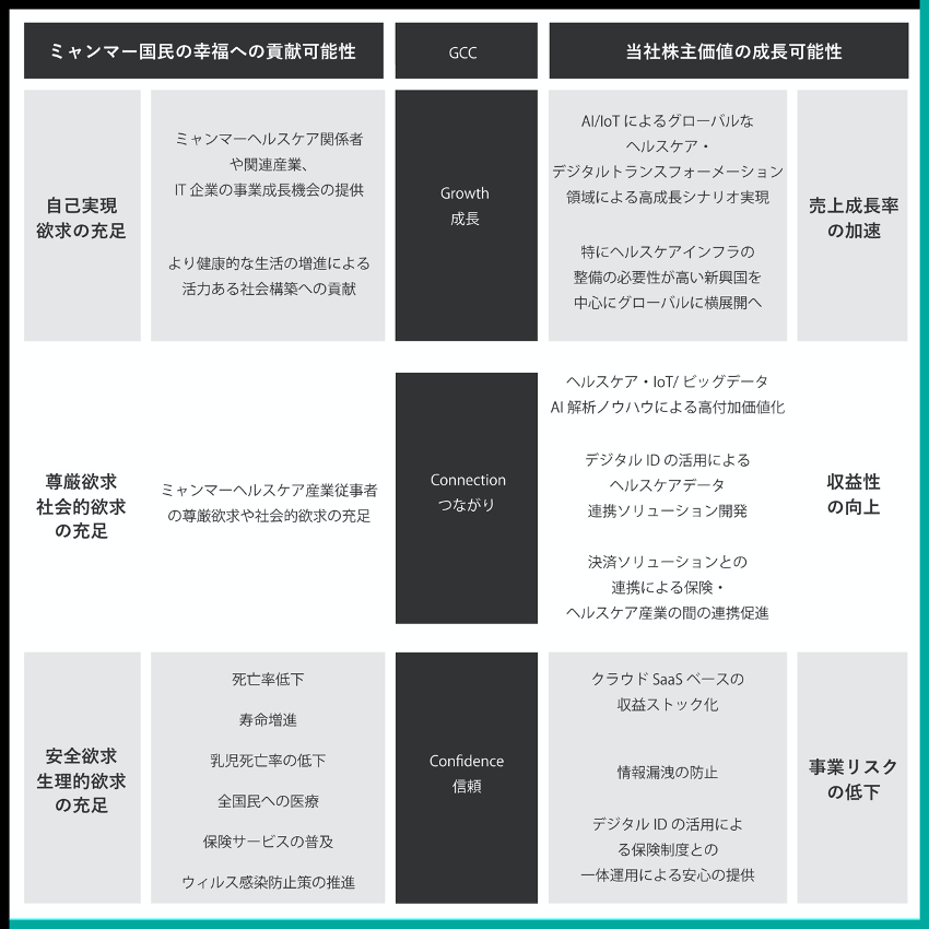 当社の株主価値向上に対して潜在的に大きな影響を与える可能性の追求とともに、ミャンマー国民の幸福に対して幅広い視点での貢献の実現を長期的に目指します。