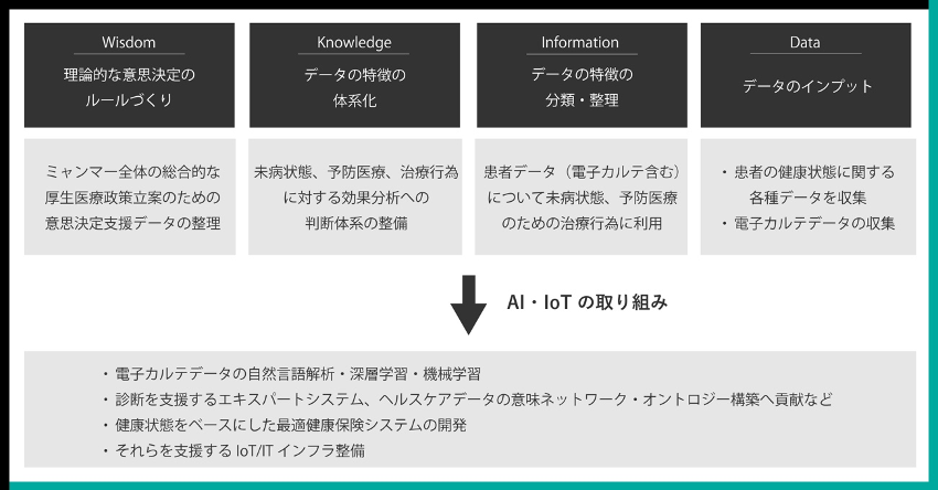 なお、ヘルスケアや健康状態に関する情報は機微情報であるため、先進国ではデータ連携活用が困難なケースが多いですが、スマートフォンを使ったコミュニケーションが進んでいるミャンマーにおいては、アプリでユーザの健康管理を促し、有用な情報を提供することにより、健康維持のために積極的に個人情報をインプットする環境を提供し、より幅広いデータを収集する体制を将来的に展開することにより、質の高い分析が可能になると考えます。