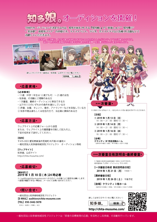 一般社団法人知多娘地域活性プロジェクト(所在地:愛知県東海市)は、知多半島をPRするご当地萌えキャラ「知多娘。」の担当声優を決めるオーディション参加者の募集を開始しました。エントリー期間は、2019年1月10日(木)必着となります。