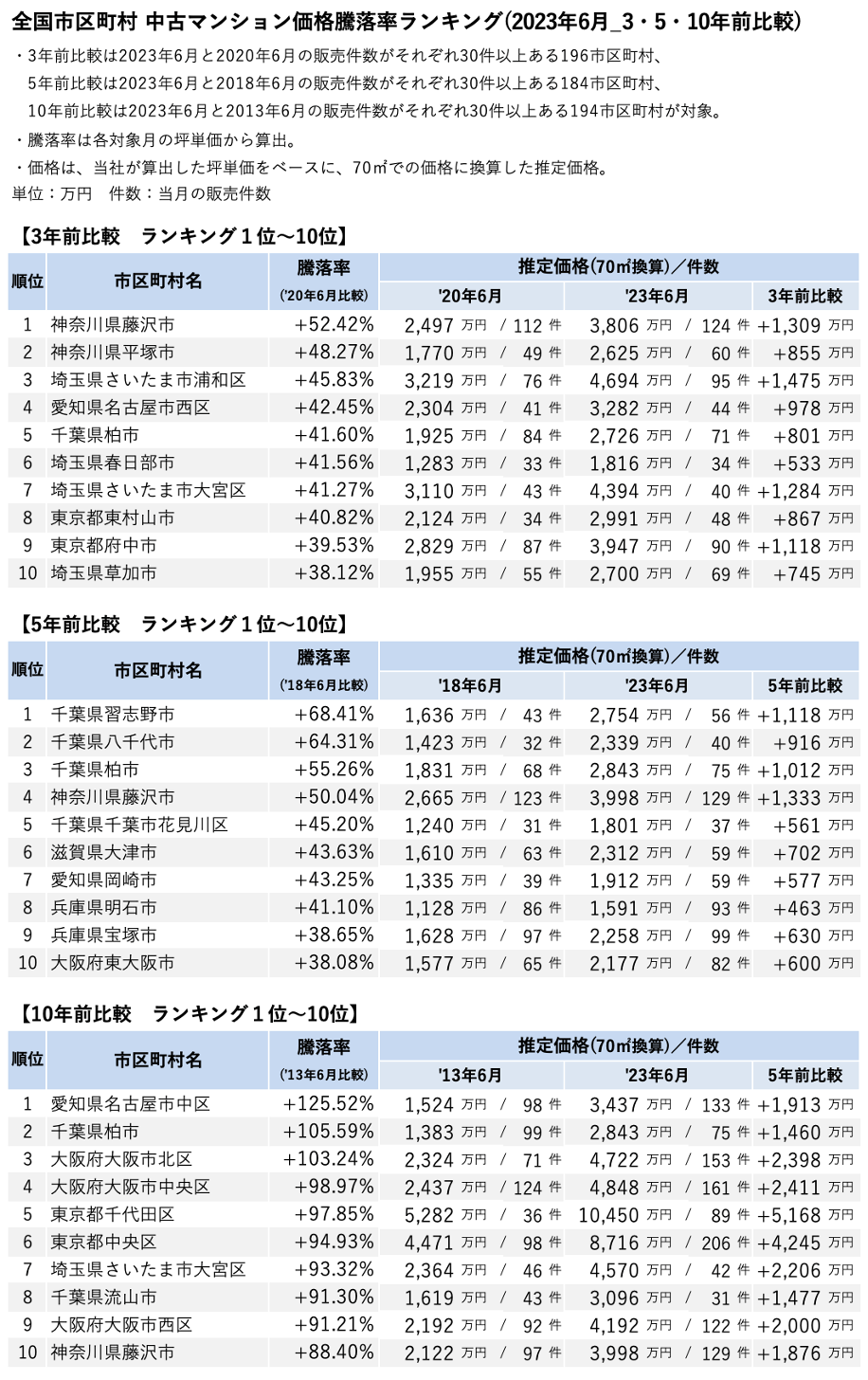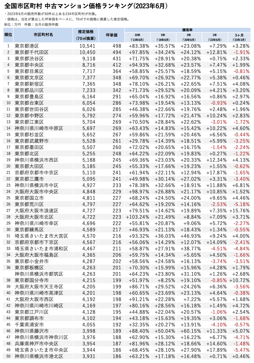 「マンションレビュー」2023年6月 全国市区町村 中古マンション価格/騰落率ランキング100を発表