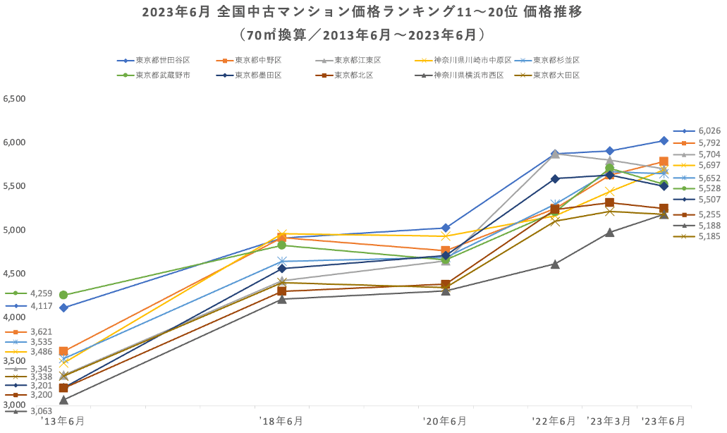 • 2023年5月の価格ランキングでは上位10件以内に「神奈川県川崎市中原区」がランクインしたが、6月は再び東京都23区で占められた。