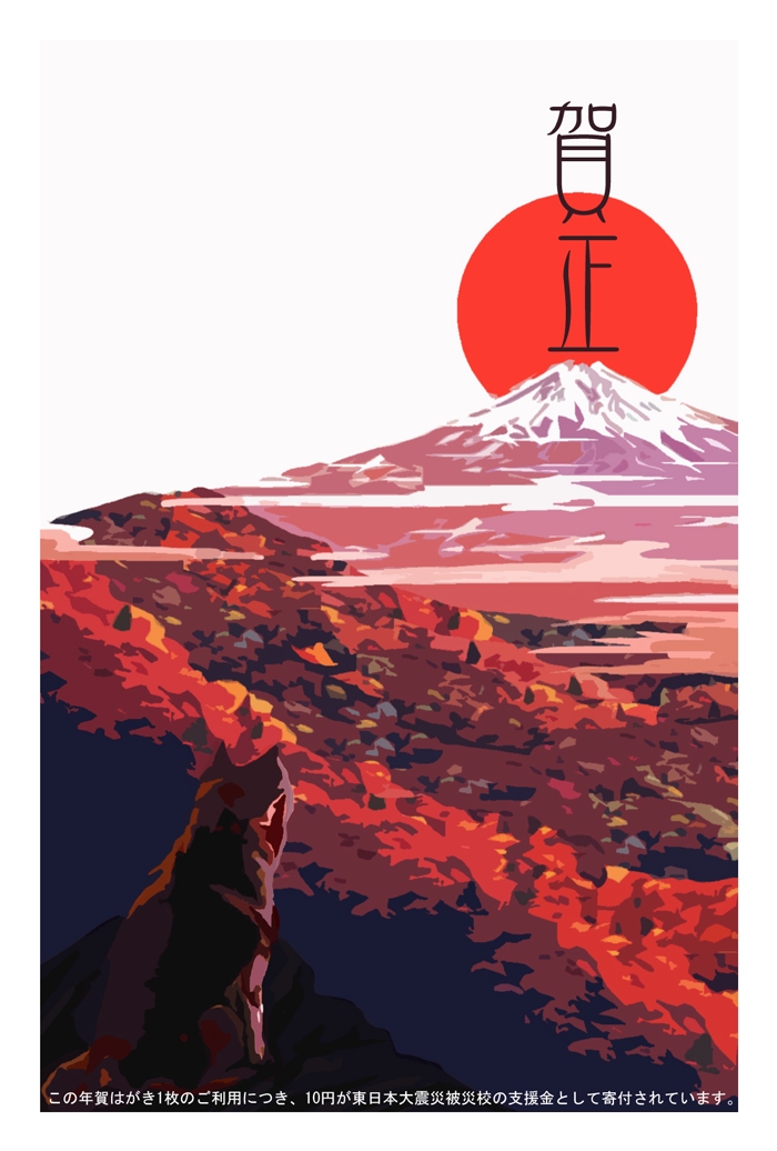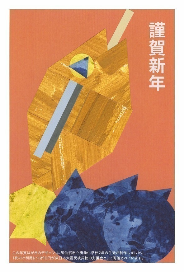今年度販売予定の「チャリティー年賀状」は、(1)博報堂アイ・スタジオが開催している「チャリティー年賀状 学生デザインコンテスト」へ応募された899作品の中から、厳正な審査を通過した入選作品102点と、(2)気仙沼市立唐桑中学校の2年生が「チャリティー年賀状 デザイン教室」で制作した42点からなる全144点です。
