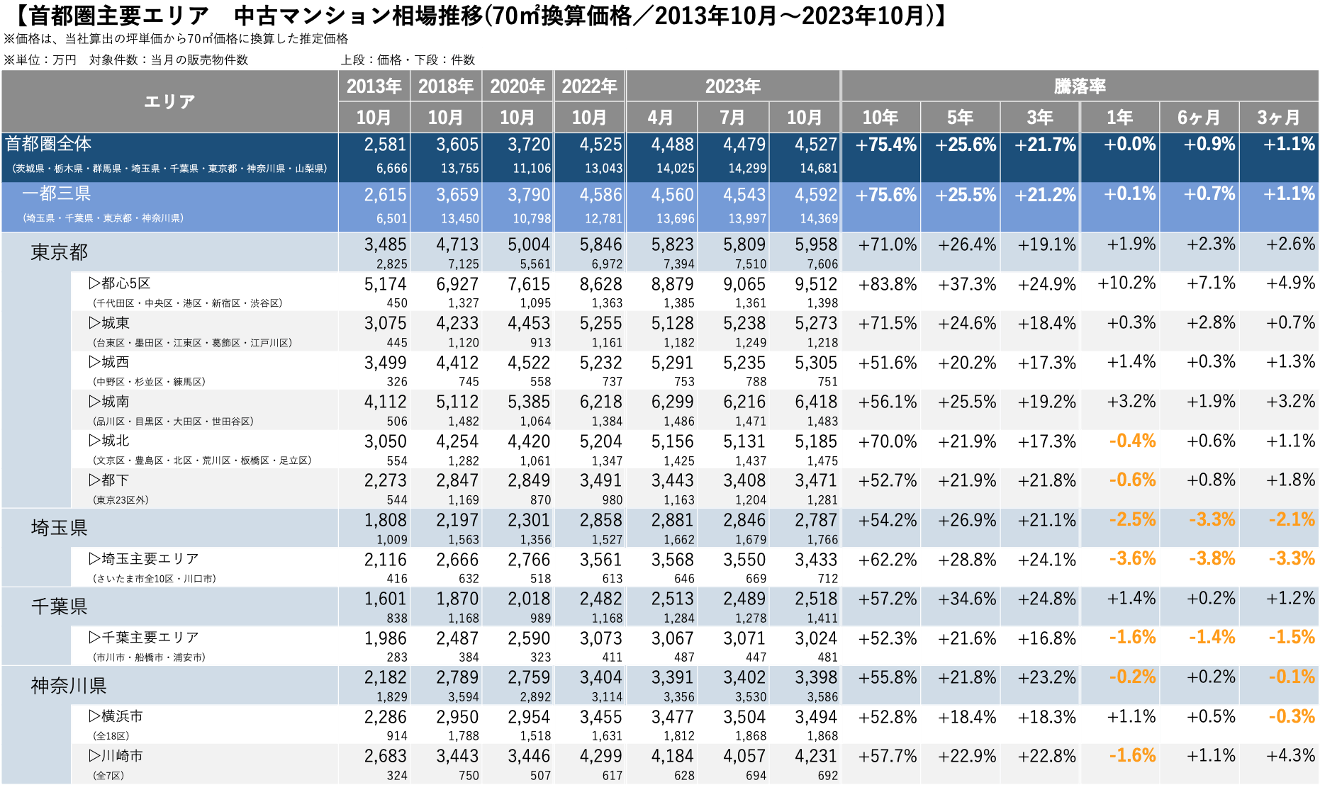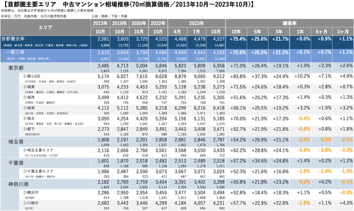 「マンションレビュー」2023年10月 全国主要エリア/47都道府県 中古マンション相場推移を発表