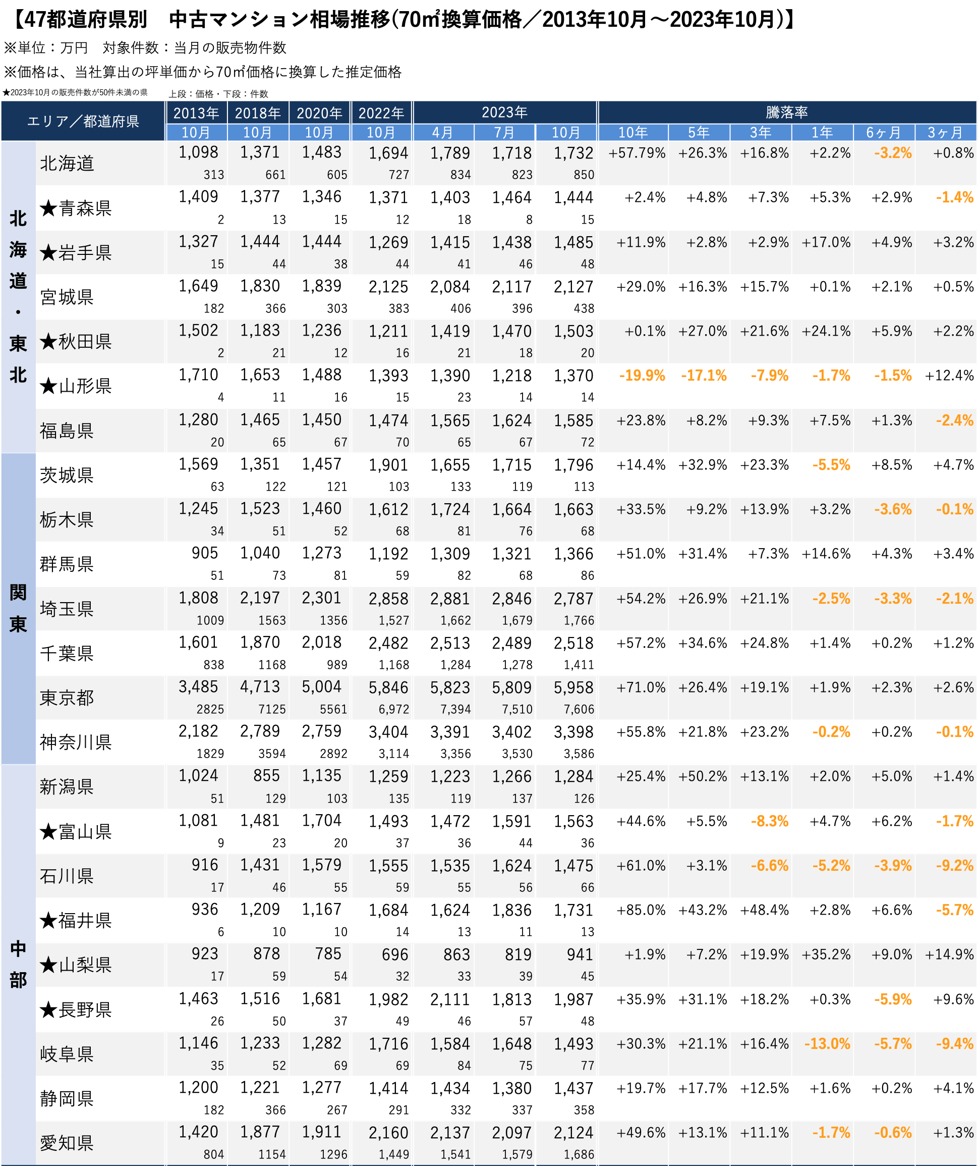 ■47都道府県別 中古マンション相場推移(2013年10月~2023年10月)
