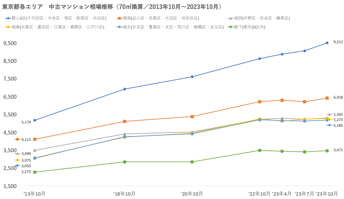 ■首都圏主要エリア 中古マンション相場推移(2013年10月~2023年10月)