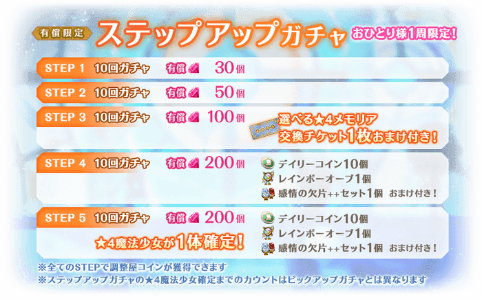 各STEPに応じて、消費する有償マギアストーンの個数や、獲得できるおまけが異なりSTEP3では「選べる★4メモリア交換チケット」を1枚獲得でき、さらに、STEP5では★4魔法少女が確定で登場いたします。