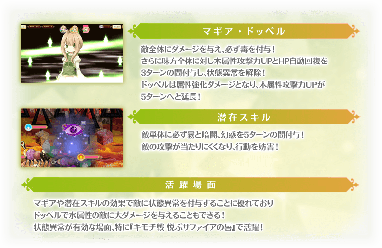 スキルで「毒」や「幻惑」といった状態異常を付与してくるため、敵のスキルを妨害する「スキル不可」や、付与された状態異常を解除、もしくは状態異常耐性をUPし状態異常を防ぐコネクトやマギアを持った木属性の魔法少女を編成、またはメモリアを装備することが有効です。
