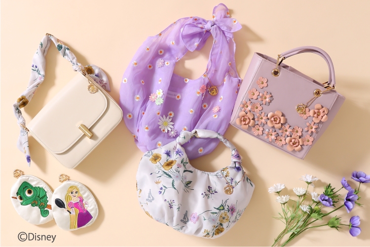 バッグは、プリンセス気分いっぱいのラプンツェルの花飾りをイメージしたデザイン。ラプンツェルと大親友パスカルを刺繍したポーチは、ころんと丸い形でアクセントに。
