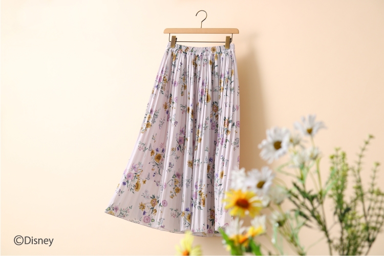 オリジナルのフラワープリントを使用したプリーツスカート。ウエストはゴム仕様で、リラックスした着こなしに。
