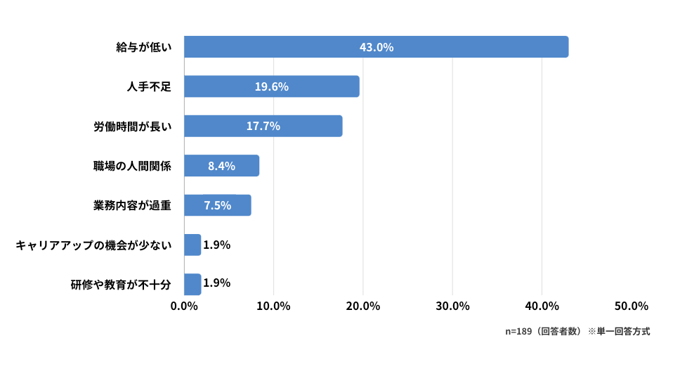 ・不満の理由は、「給与が低い」「人手不足」「労働時間が長い」