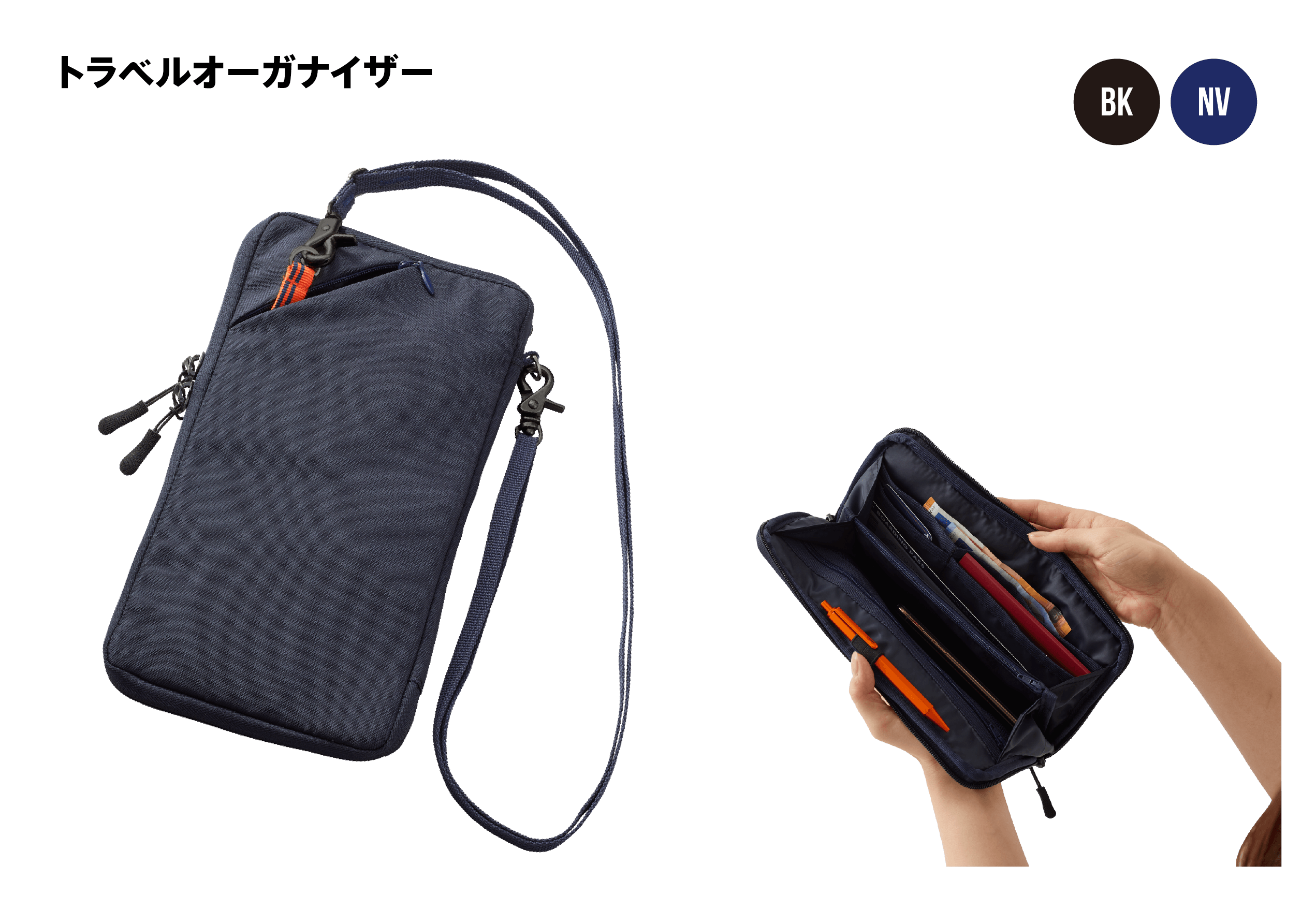 特徴:パスポート、クレジットカード、キャッシュ、スマートフォン、チケットなど、空港や旅先で必要不可欠なものを