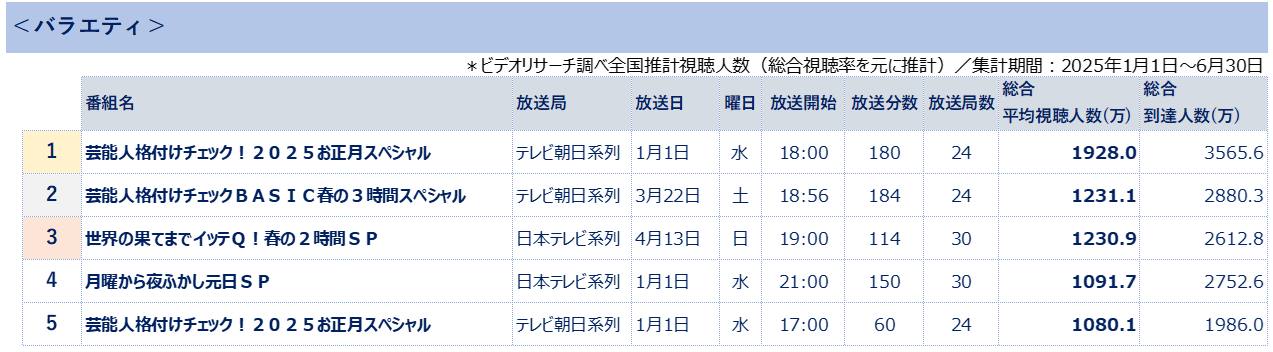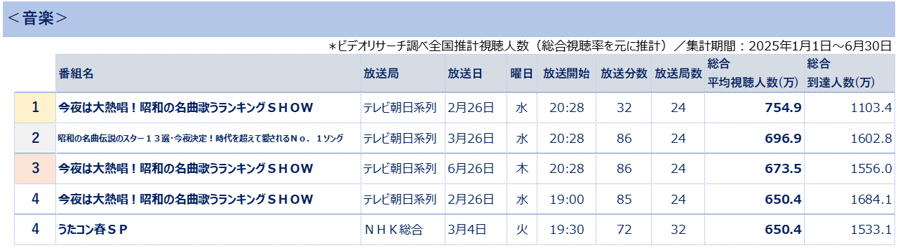 株式会社ビデオリサーチ(本社:東京都千代田区、代表取締役社長執行役員:石川 豊)は、全国32の全放送エリアにて、毎日、個人単位のテレビ視聴状況をリアルタイム視聴および、タイムシフト視聴も対象に調査しています。今回、総合視聴率(リアルタイムもしくは7日内のタイムシフトでの視聴)をもとに算出した2025年上半期の全国推計視聴人数を取りまとめましたのでお知らせします。