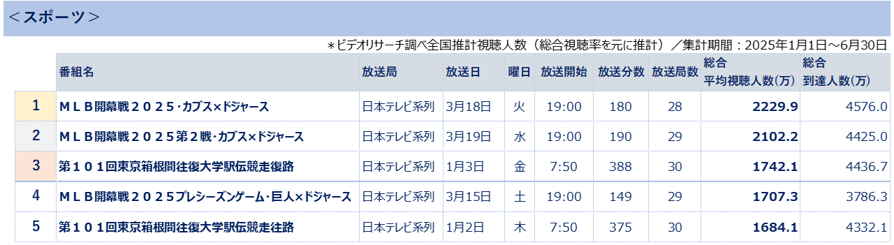 ビデオリサーチ調べ2025年上半期テレビ番組視聴人数ランキング、 MLB開幕戦が上位