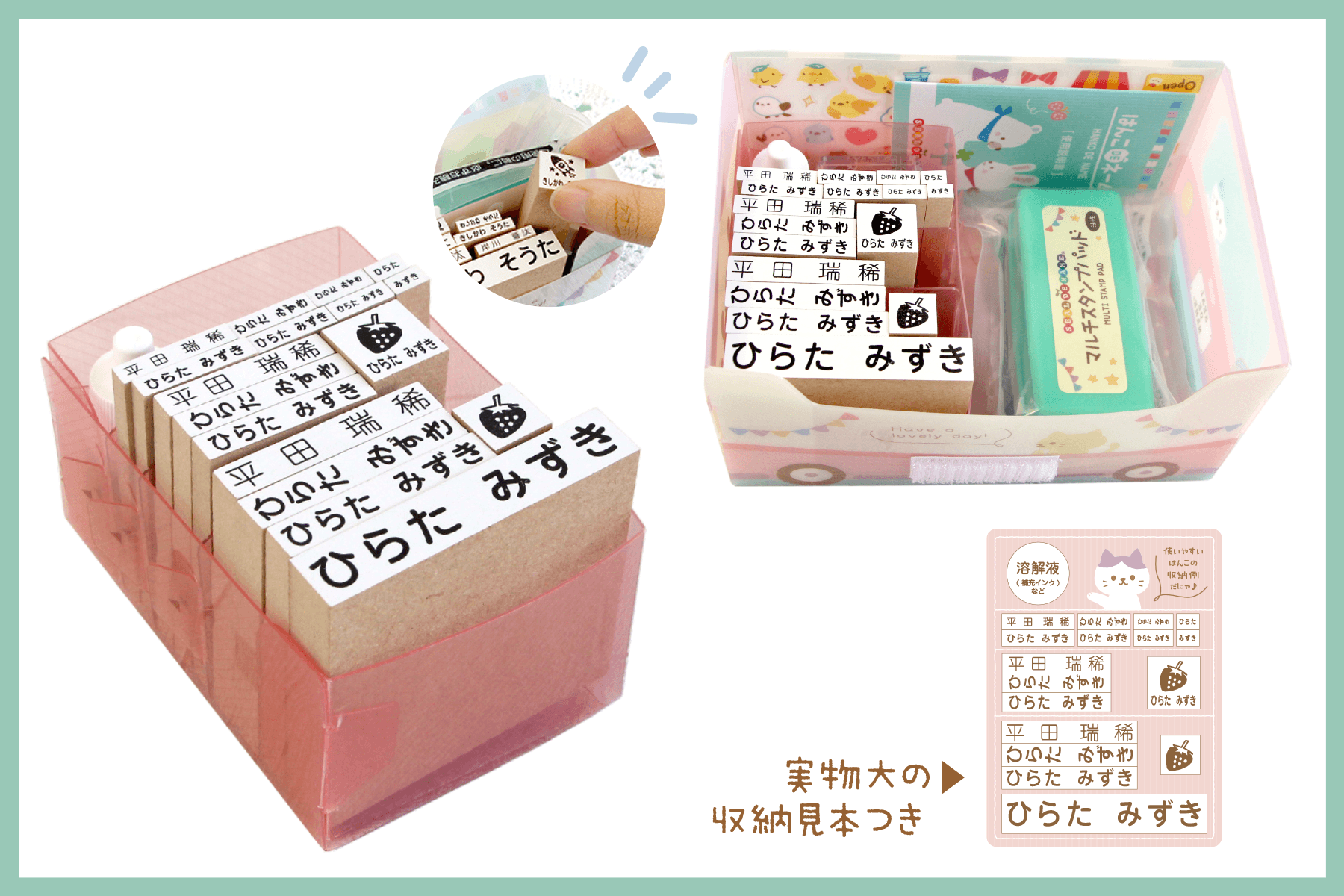 ■セット内容:お名前スタンプ16本、ぷちスタンプ1本、マルチスタンプパッド、バーサクラフトインク、インク溶解液、収納ケース(デコシールつき)