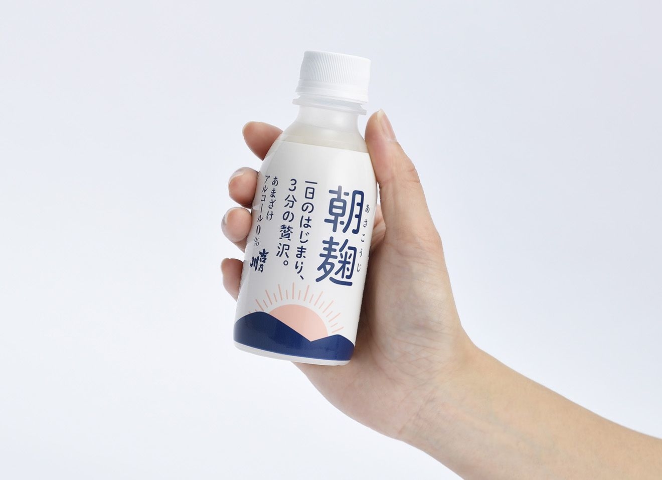 毎朝、牛乳やヨーグルトを食べるように、朝の習慣として「朝麹」を飲んでいただくことを目的としています。毎日が忙しいサラリーマンやOLの方の栄養補給から、ご家族の健康維持にも。また、ノンアルコールなのでお子様でも安心してお飲みいただけます。パッケージも白を基調に山から朝日が昇るアイコンで、晴れやかな朝をイメージ。
