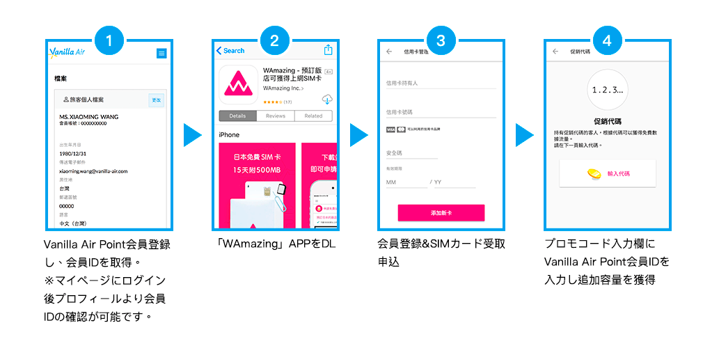 『Vanilla Air Point』の会員IDをWAmazingのアプリに入力することでSIM容量を最大1GB無料で進呈する。(15日間使用可)。