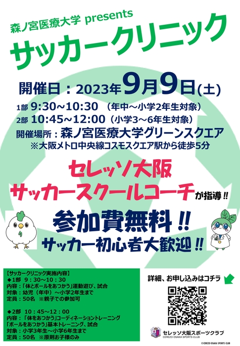 9月9日(土)「セレッソ大阪スポーツクラブ」と協力して、年中~小学6年生向けの「サッカークリニック」を開催いたします。セレッソ大阪のサッカースクールコーチに直接ご指導いただける貴重な機会です。※申込は締切ました。