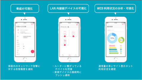 なお、これらのリスクに対する検知や防御したインシデント情報、またWEBの利用状況やLAN内の接続デバイスなどは、スマホアプリで表示することができます。