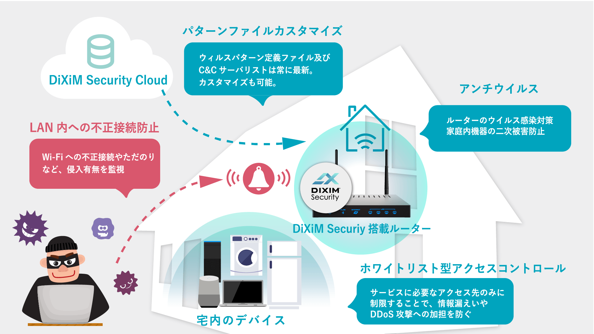 「DiXiM Security」は、ルーターやセキュリティボックスなどのネットワーク機器や、スマートホームやスマート家電への提供を想定した、セキュリティ機能組み込みサービスです。