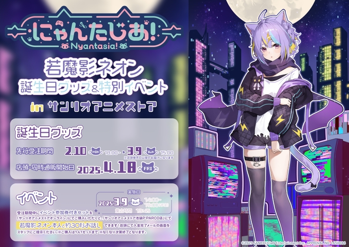 株式会社ClaN Entertainment(本社:東京都港区 代表取締役社⻑:⼤井 基⾏、以下ClaN)は、株式会社サンリオ(本社:東京都品川区)と共同で行うVTuberプロジェクト「にゃんたじあ!」に所属する「若魔影ネオン」が2月9日に誕生日を迎えたことを記念し、誕生日グッズの販売を行います。