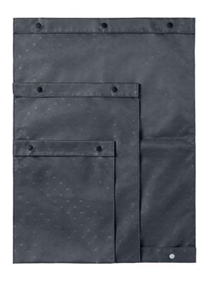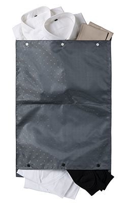 ±0スーツケースの内装生地と同じもので作った3サイズのポーチです。Sサイズは小物まとめに、Mサイズは衣料やシューズに使えます。Lサイズは中央で分割された両開きタイプ、上下でスナップの色を変えてあるので未使用の下着をグレースナップ側で保管、使用済みの下着をブラックスナップ側に収納等、滞在時の衣類の仕分けに便利です。