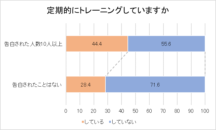 定期的にトレーニングをしているかという質問に関して、告白された人数で結果を比較しました。告白されたことがない人のうち、定期的にトレーニングをしていると回答した割合は、28.4%だったのに対し、10人以上から告白されたことがある人は44.4%と、告白された人数の多い人の方が、定期的にトレーニングしている人の割合が高いということが分かりました。