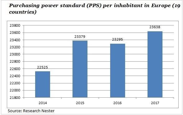 世界中の人口の増加する可処分所得と上昇する工業化は、予測期間中に全体的なベビーフード市場を推進すると予想されます。さらに、人口の増加する収入、およびさまざまな食品への高い支出は、市場全体の成長を促進すると予想されます。ユーロスタットによると、購買力基準は23,295から23,638に増加しました。
