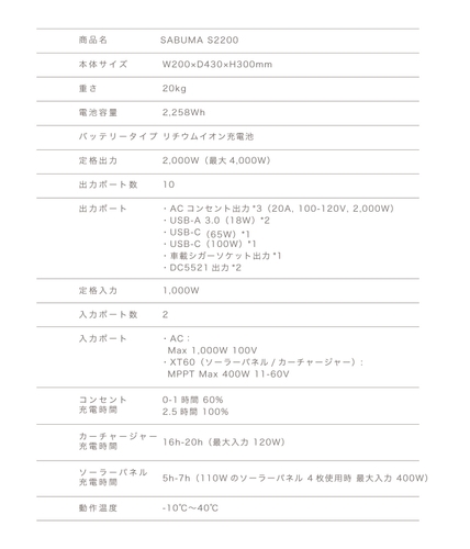 ・AC100V 1,000W充電、ソーラー充電、車載ソケット充電