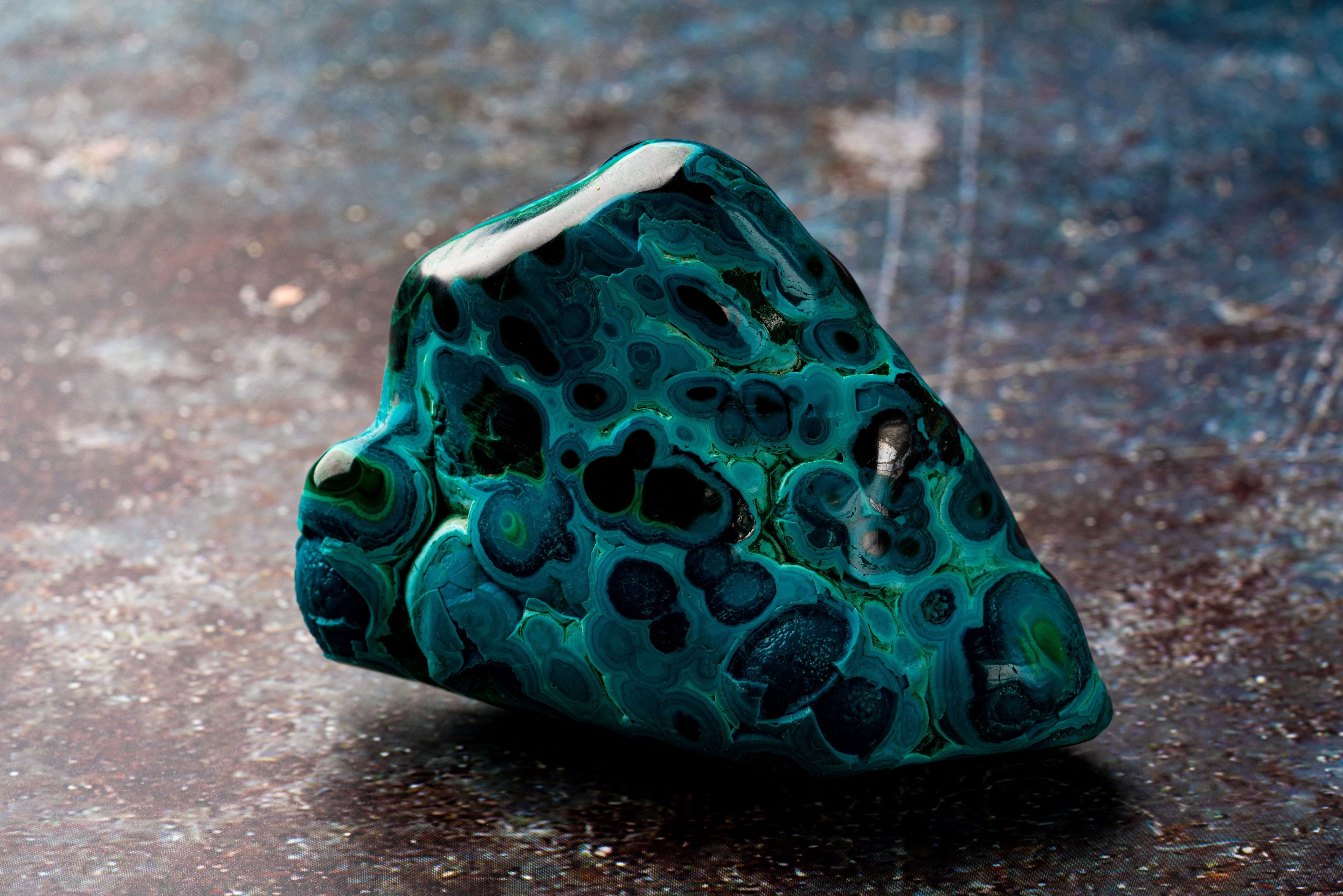 『マラカイト』は深みのあるグリーンと独特の縞模様が魅力的な石で、研磨することで独特な縞や同心円状の模様ができ、その模様が孔雀の羽に似ていることから和名では孔雀石と呼ばれ、神秘的な石として多くの人に愛されています。