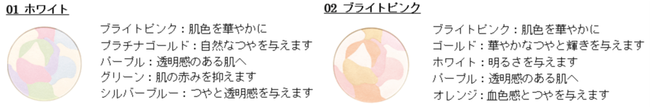 「01 ホワイト」はつやと透明感を与え、「02 ブライトピンク」はつやと血色感を与えます。