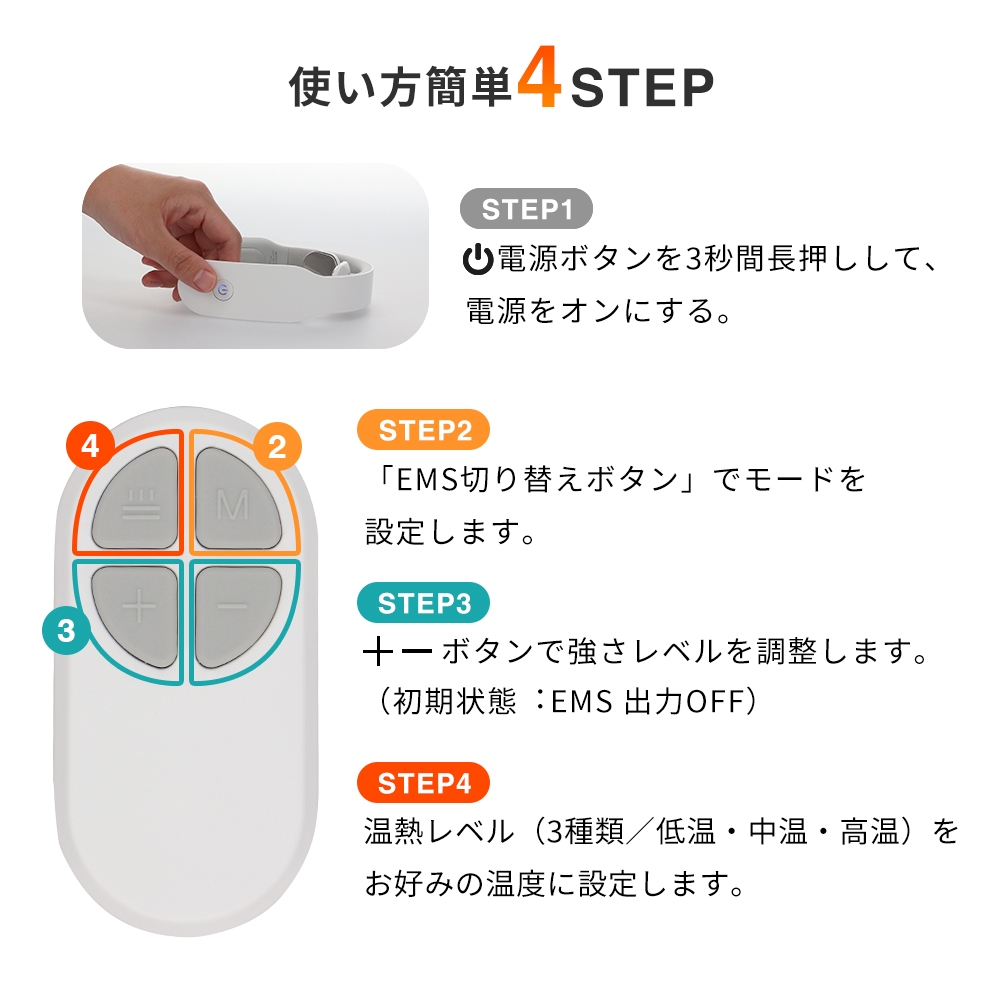 電源→モード設定→強さレベルの設定→温熱レベルの設定と使い方も簡単な「4STEP」になっています。